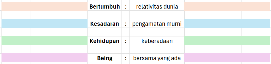 Being – kehidupan – kesadaran – bertumbuh, sebuah perjalanan dari “hanya ada” sampai dengan “bertumbuh”. Tahapan singkat namun dapat mewakili secara keseluruhan dari sebelum awal dan setelah akhir.